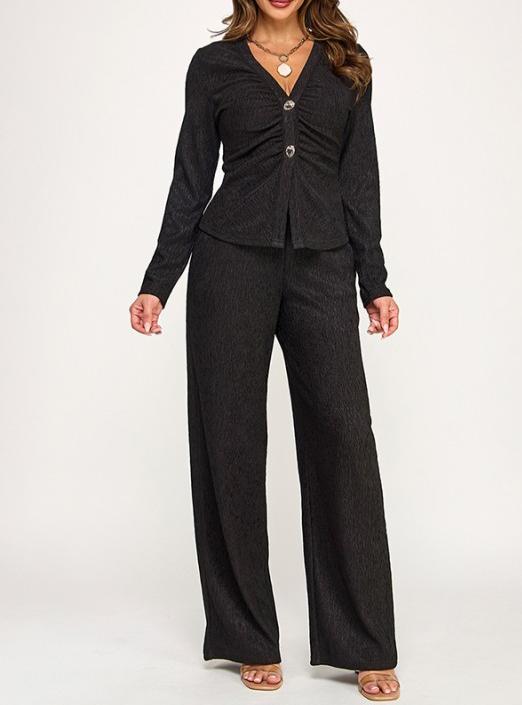 Este set negro de manga larga y pantalón palazo combina elegancia y comodidad en una sola pieza. Confeccionado en tela de algodón, es súper fresco, suave y cómodo, ideal para lucir en fiestas o eventos especiales.